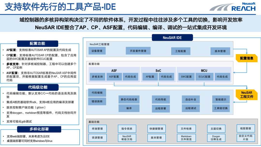 為軟件開發(fā)提供了一站式集成開發(fā)環(huán)境。目前不少車企在軟件開發(fā)過程中使用的工具鏈十分零散,工具兼容性差,導致開發(fā)效率低、難以高效協(xié)作等問題層出不窮。NeuSAR IDE讓開發(fā)者可在一套工具鏈中完成整個開發(fā)過程,在統(tǒng)一的環(huán)境里實現(xiàn)代碼生成和編譯,對AUTOSAR AP/CP、ASF等框架組件進行統(tǒng)一的配置的視圖等,保證軟件開發(fā)系統(tǒng)在硬件尚未完成的情況下實現(xiàn)虛擬化、云端的部署和調試,從而加快開發(fā)效率。