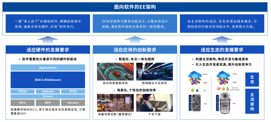 “創(chuàng)新速度”與“成本”的催化下,實(shí)現(xiàn)多域融合、自動(dòng)駕駛、整車控制到人車交互等綜合的場(chǎng)景化、智能化服務(wù),需要“集中式”SOA軟件架構(gòu)設(shè)計(jì)方法?!凹惺健遍_發(fā)是指多控制器使用統(tǒng)一的開發(fā)視圖與開發(fā)方法,對(duì)比傳統(tǒng)的多控制器同時(shí)開發(fā),“集中式”開發(fā)的速度更快,更容易實(shí)現(xiàn)一次開發(fā)多車型通用,在OTA升級(jí)頻率、代碼量、開發(fā)方式、開發(fā)效率等外在表現(xiàn)價(jià)值方面來(lái)看尤為明顯。