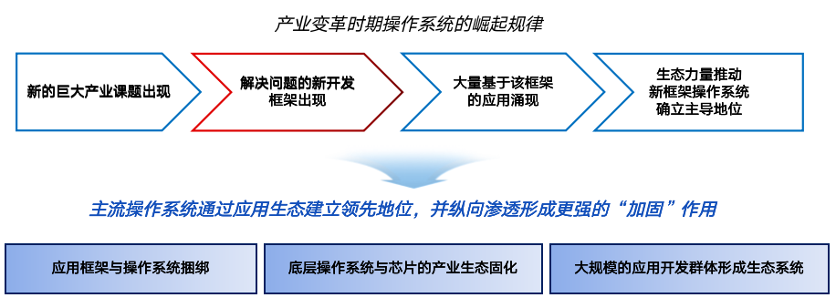 總結(jié)歷史經(jīng)驗(yàn),成功操作系統(tǒng)發(fā)展壯大的決定性拐點(diǎn),是某個解決這個巨大課題的開發(fā)框架出現(xiàn),以及在這個框架上開發(fā)的大量應(yīng)用軟件的涌現(xiàn)。如 Windows 系統(tǒng)中的.net 應(yīng)用開發(fā)框架、Android 系統(tǒng)中的 AOSP 應(yīng)用開發(fā)框架通過扮演“承上啟下”的支撐角色,對操作系統(tǒng)最終建立生態(tài)確立主導(dǎo)地位,起到了更為核心的價值作用。