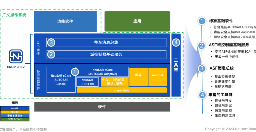 在不斷承上啟下、應(yīng)用創(chuàng)新中,東軟睿馳自主研發(fā)的 NeuSAR ——跨域融合的基礎(chǔ)軟件和中間件,通過與諸多本土芯片、微內(nèi)核企業(yè)的共同協(xié)作,不斷的發(fā)展壯大,積極推動生態(tài)系統(tǒng)的發(fā)展。