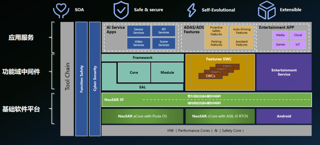 基于近20年的自動駕駛研發(fā)經(jīng)驗,東軟睿馳構(gòu)建了開放、標(biāo)準(zhǔn)化的SOA軟件架構(gòu),并發(fā)布了支持多域融合的軟件平臺NeuSAR 4.0版本,將開發(fā)視圖從域控制器層面向整車層面遷移,解決多核異構(gòu)域控制器的軟件部署難題,降低軟件開發(fā)難度,提高軟件復(fù)用度。