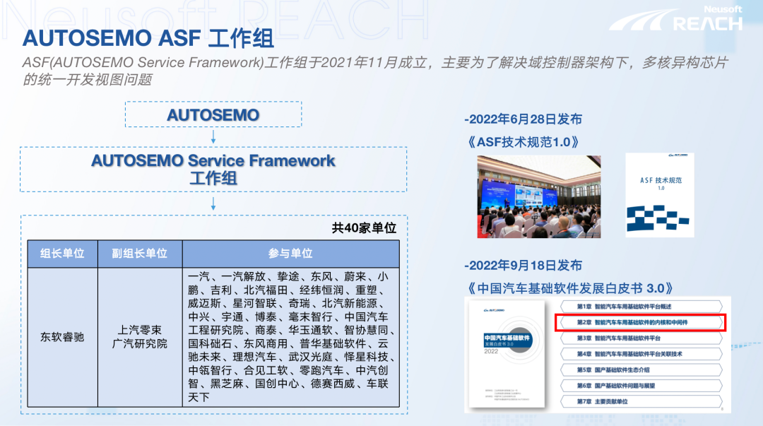 東軟睿馳作為中國汽車工業(yè)協(xié)會軟件分會汽車基礎(chǔ)軟件生態(tài)標(biāo)委會(AUTOSEMO)創(chuàng)始會員單位,聯(lián)合廣汽研究院及國內(nèi)主流車企、零部件供應(yīng)商單位進(jìn)行ASF技術(shù)規(guī)范的立項、調(diào)研、組織修訂和編制等工作。ASF面向SOA服務(wù)開發(fā)視角,構(gòu)建了進(jìn)一步向應(yīng)用層、SOA體系架構(gòu)拓展的中間框架,通過提供系統(tǒng)級服務(wù)、SOA+、原子服務(wù)、整車級系統(tǒng)服務(wù)、動態(tài)服務(wù)等,助力整車在軟件架構(gòu)層面上實現(xiàn)相對標(biāo)準(zhǔn)化、穩(wěn)定并且有生態(tài)支撐的應(yīng)用運(yùn)行體系框架。