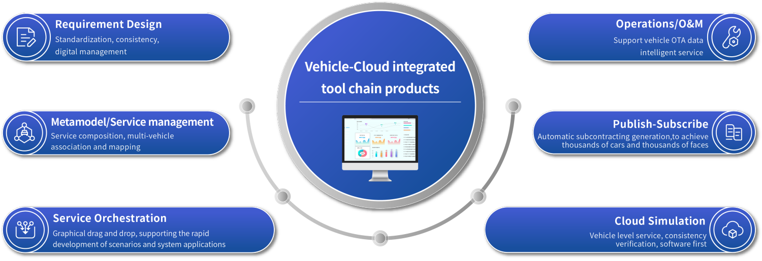 Based on the standard SOA development process, Neusoft Reach vehicle-cloud Integrated Tool Platform provides one-stop agile development tools including service development, scenario service layout, simulation verification, big data analysis and other functions, making development as fast and convenient as building blocks and effectively improving the development efficiency of complex scenarios.