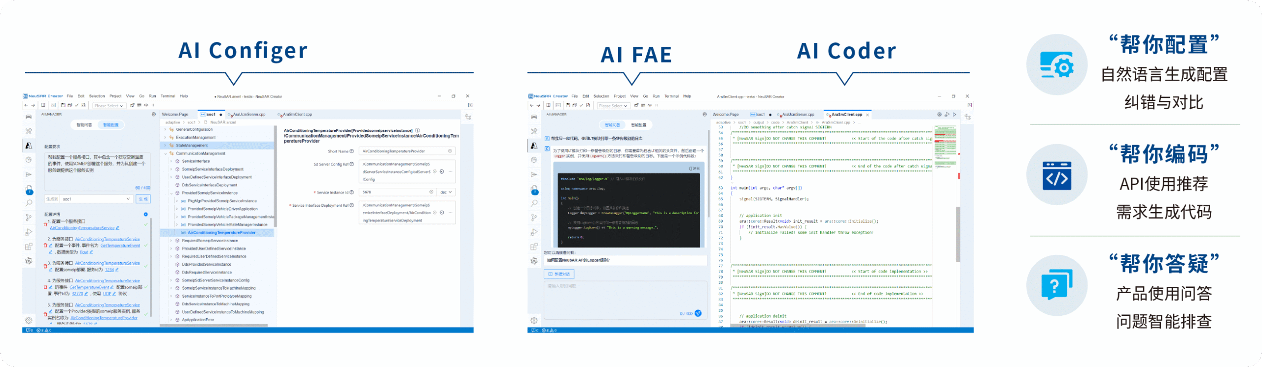NeuSAR AI工具鏈,提供針對(duì)域控制器級(jí)&整車級(jí)設(shè)計(jì)、開發(fā)、調(diào)試、仿真于一體的全流程生態(tài)工具鏈,并通過AI技術(shù)提供一系列智能化輔助功能,大幅降低開發(fā)復(fù)雜度,實(shí)現(xiàn)降本增效。